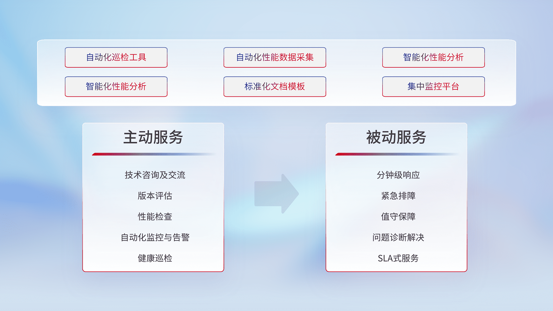 智能化工具和标准化文档,,,,保障服务质量,,,,提供主动服务(包含技术咨询、、版本评估、、、、性能检查、、、自动化监控与告警、、健康巡检)和被动服务包含(分钟级响应、、紧急排障、、值守保障、、、问题诊断解决、、、、SLA服务)。。。。